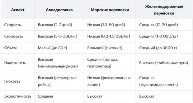 Этот анализ показывает, что авиа подходит для премиум-сегмента, море — для массового производства, ЖД — для баланса.