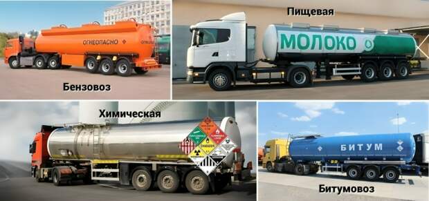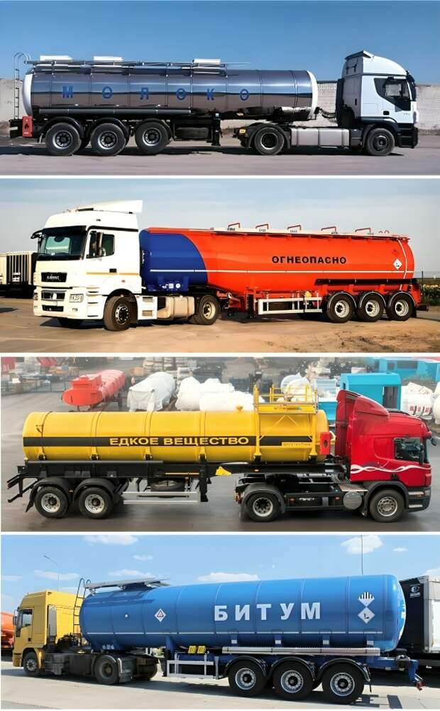 - Автоцистерны. Объем 20-40 м³, материалы — алюминий, сталь. Виды: изотермические (для пищевых), с подогревом (для битума), многосекционные. Допускаются 4- или 8-осные модели.